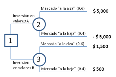 Se utilizan dos tipos de nodos en el árbol de decisión: un cuadrado que representa un punto de decisión y un círculo que representa un evento de posibilidad. De esta forma, surgen dos ramas del punto de decisión para representar las dos alternativas de invertir en acciones A o B. En seguida las dos ramas que emanan de los eventos de posibilidad 2 y 3 representan los mercados “a la alza” y “a la baja” con sus respectivas probabilidades y resultados.
